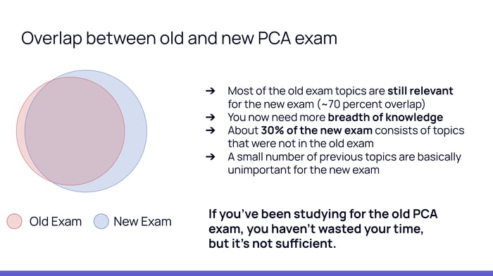 However, you now need a greater breadth of knowledge. About 30% of the new exam consists of topics that were not in the old version at all. On the flip side, a small number of previous topics are now basically unimportant or have been deprioritized.