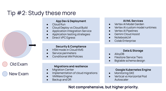 Security and compliance: Be familiar with HSM mode in Cloud KMS and service perimeters via VPC Service Controls. Conditional IAM policies are also a newer addition to the exam.