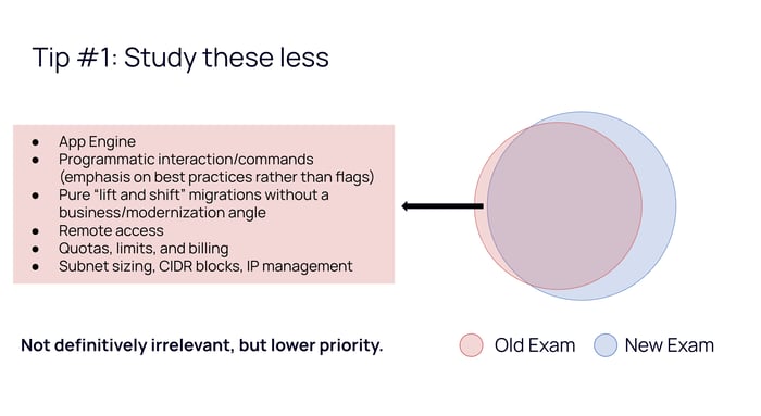 The good news is, most of the old exam topics are actually still relevant. I estimate there is a 70% overlap between the two versions. If you have been studying for the old version of the exam, and especially if you've been focusing on GCP bread-and-butter services, or foundational concepts, you have not wasted your time. However, the remaining 30% consists of topics that were not in the old exam at all.